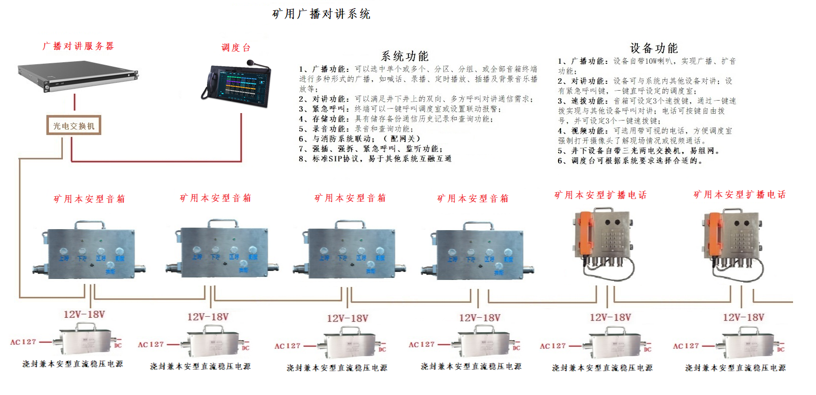 礦用應(yīng)急廣播系統(tǒng),由廣播服務(wù)器、調(diào)度臺(tái)或主控臺(tái)、交換機(jī)、本安型音箱和擴(kuò)播電話等廣播對(duì)講終端組成,實(shí)現(xiàn)廣播、對(duì)講、調(diào)度、錄音等功能,滿足非煤礦山和礦山的復(fù)工復(fù)產(chǎn)所需應(yīng)急廣播系統(tǒng)的需求